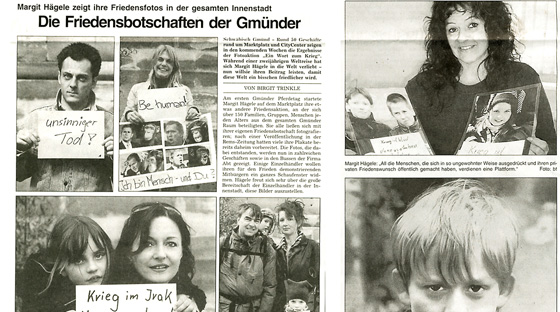 Stimmungsbilder aus der Bevölkerung In verschiedenen Städten unterschiedlicher Länder werden Stimmungsbilder und Meinungen zum Thema Krieg - Frieden, der Menschen aufgezeigt. Ziel ist es, die Menschen mit ihrer Meinung und ihren individuellen Statements abzulichten, ihr Portrait plus Meinung, um sie damit aus der "Anonymität" von z.B. Unterschriftensammlungen herauszuheben. Begleitend werden bei jeder Aktion die Bilder der vorigen Städte und Menschen ausgestellt. So können sich die Besucher einer Ausstellung 'aktiv' an der / für die nächste Ausstellung beteiligen. Das Projekt wird dokumentiert. Es wird ein Bildband als Zusammenfassung erscheinen. Meine Intuition besteht darin, den Menschen eine Plattform zu bieten, ihre Meinung sehr persönlich als Individuum in die Öffentlichkeit zu tragen, und selbst ein 'aktiver' Teil des Projektes zu werden.